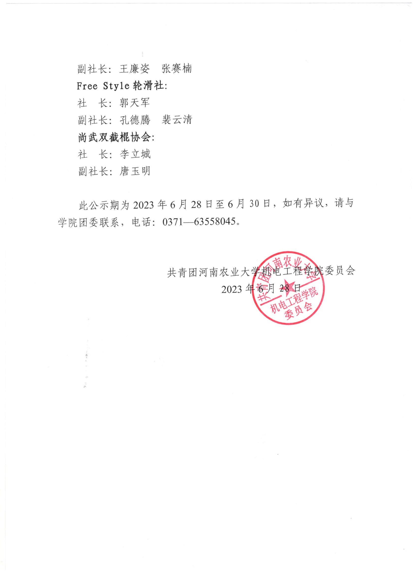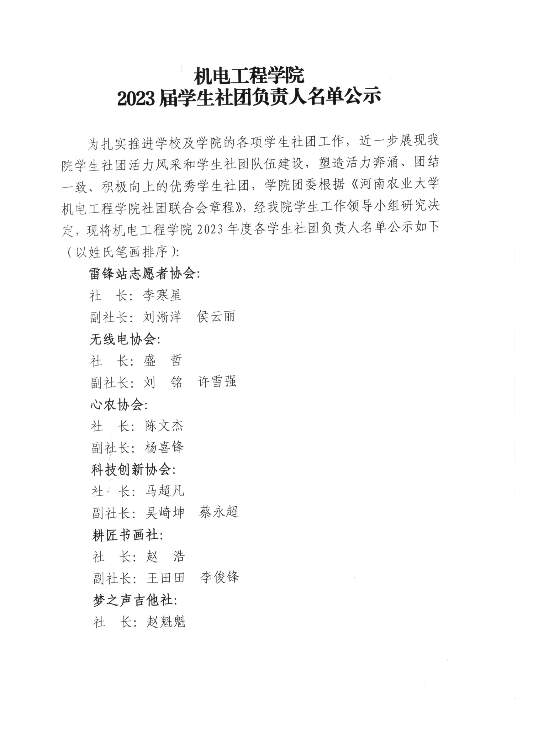 为扎实推进学校及学院的各项学生社团工作,近一步展现91社区 学生社团活力风采和学生社团队伍建设,塑造活力奔涌、团结一致、积极向上的优秀学生社团,学院团委根据《91社区 91社区 社团联合会章程》,经91社区 学生工作领导小组研究决定,现将91社区 2023年度各学生社团负责人名单公示如下(以姓氏笔画排序):