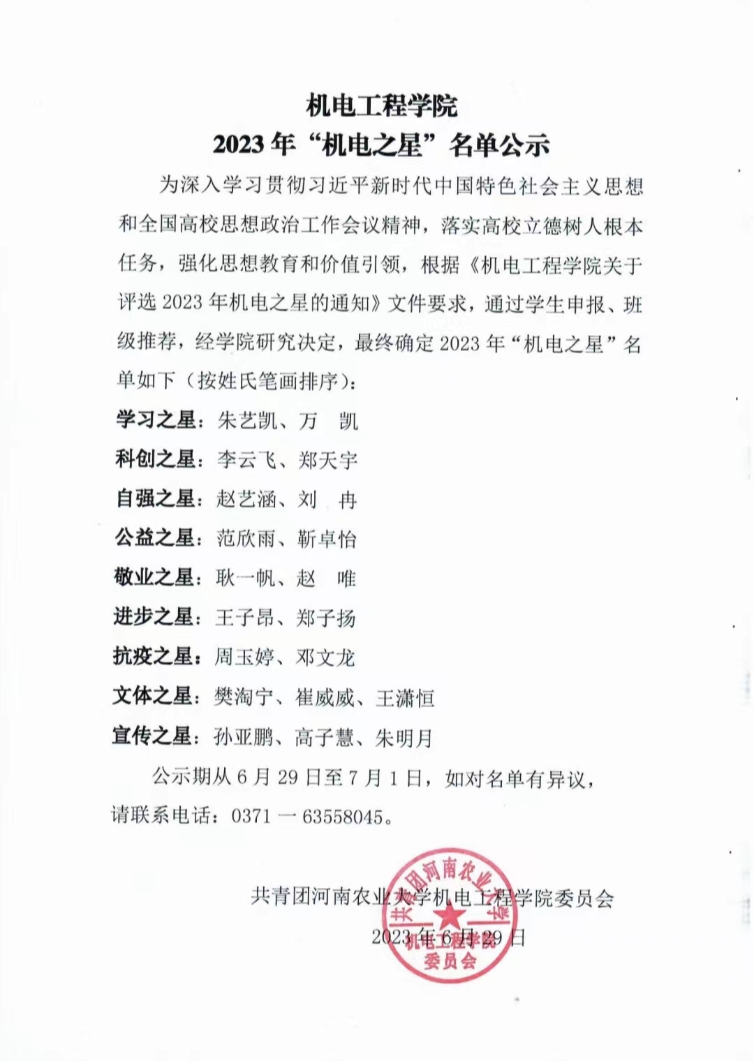 为深入学习贯彻习近平新时代中国特色社会主义思想和全国高校思想政治工作会议精神,落实高校立德树人根本任务,强化思想教育和价值引领,根据《91社区 关于评选2023年机电之星的通知》文件要求,通过学生申报、班级推荐,经学院研究决定,最终确定2023年“机电之星”名单如下(按姓氏笔画排序):