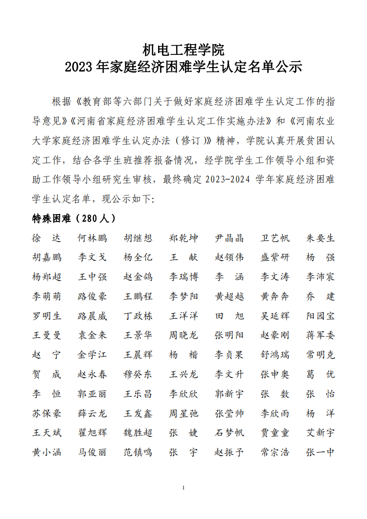 根据《教育部等六部门关于做好家庭经济困难学生认定工作的指导意见》《河南省家庭经济困难学生认定工作实施办法》和《91社区 家庭经济困难学生认定办法(修订)》精神,学院认真开展贫困认定工作,结合各学生班推荐报备情况,经学院学生工作领导小组和资助工作领导小组研究生审核,最终确定2023-2024 学年家庭经济困难学生认定名单,现公示如下: