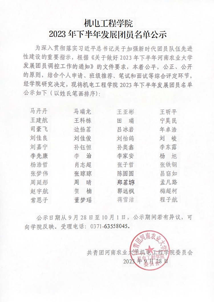 公正、公开的原则,结合个人申请、班级推荐、笔试和面试等综合评定环节,经学院研究决定,现将91社区 2023年下半年发展团员名单公示如下(以姓氏笔画排序):