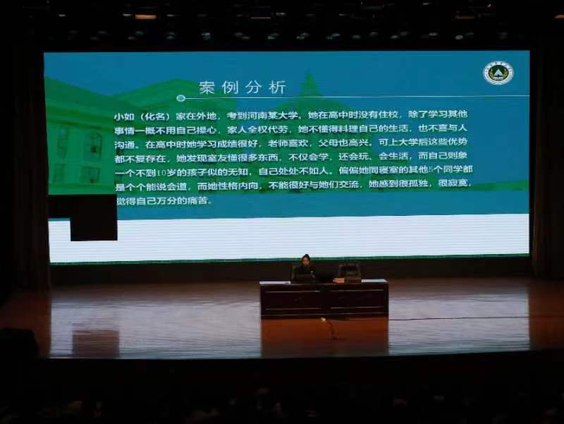 贾晓冉首先由“大学与高中的区别”问题引出今天的讲座内容,通过生动具体的案例与学生们进行互动,鼓励有需要的学生积极寻找心理委员、学校心理咨询站等寻求帮助。