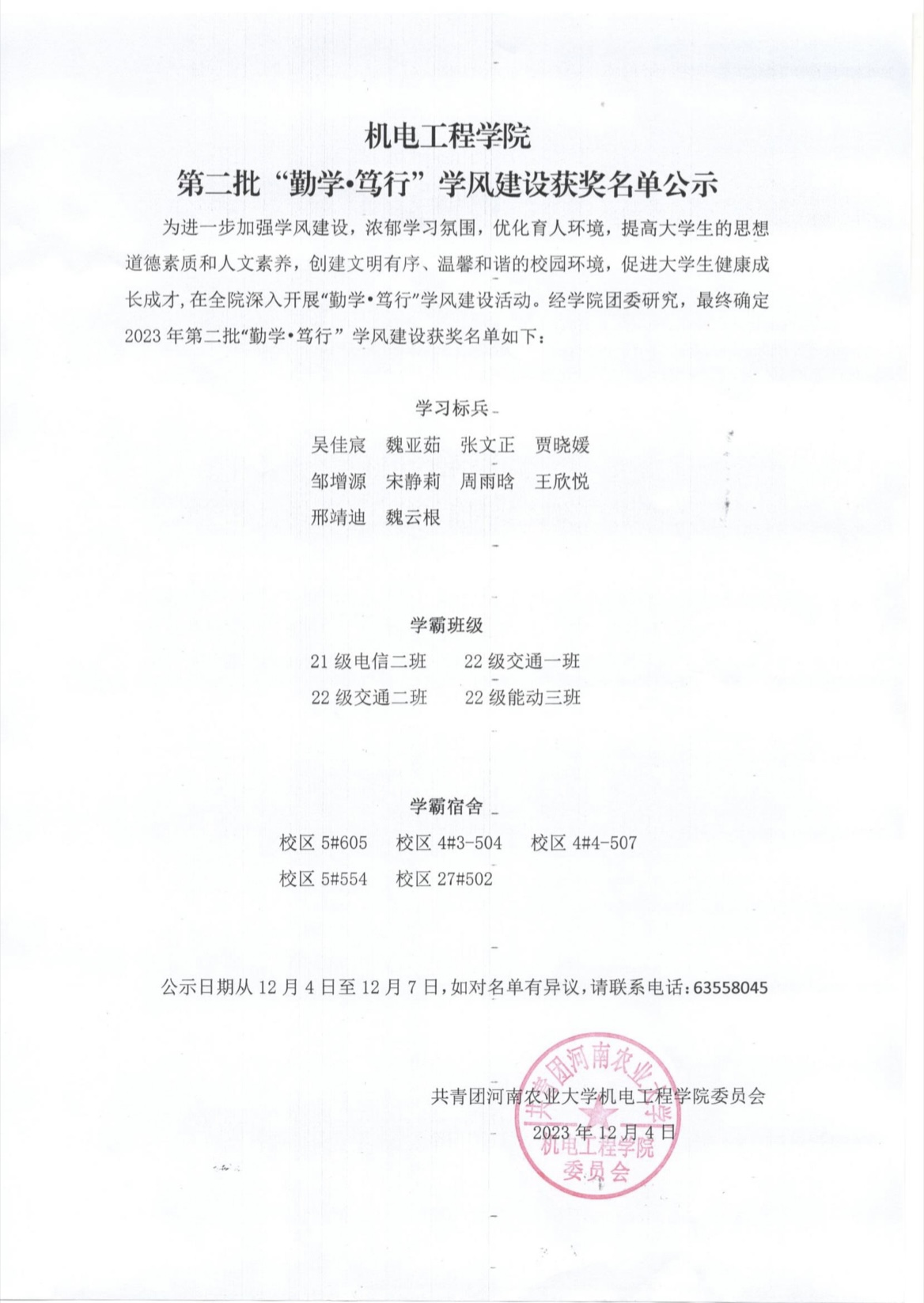 为进一步加强学风建设,浓郁学习氛围,优化育人环境,提高大学生的思想道德素质和人文素养,创建文明有序、温馨和谐的校园环境,促进大学生健康成长成才,在全院深入开展"勤学•笃行"学风建设活动。经学院团委研究,最终确定2023 年第二批“勤学•笃行”学风建设获奖名单如下: