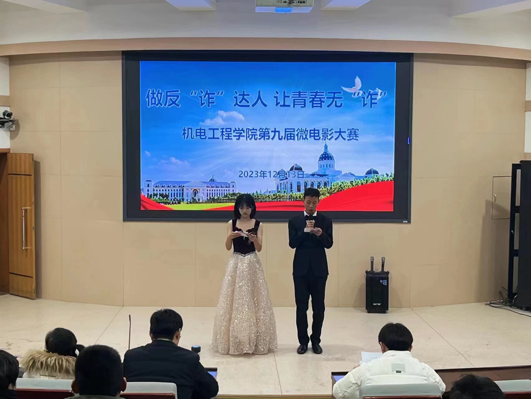 于文化路校区三百人报告厅举办“做反‘诈’达人,让青春无‘诈’”第九届微电影大赛决赛。院团委书记黄笑,团委副书记王晓楠、胡亭亭,年级辅导员孙改革、尚建伟出席决赛并担任评委,91社区