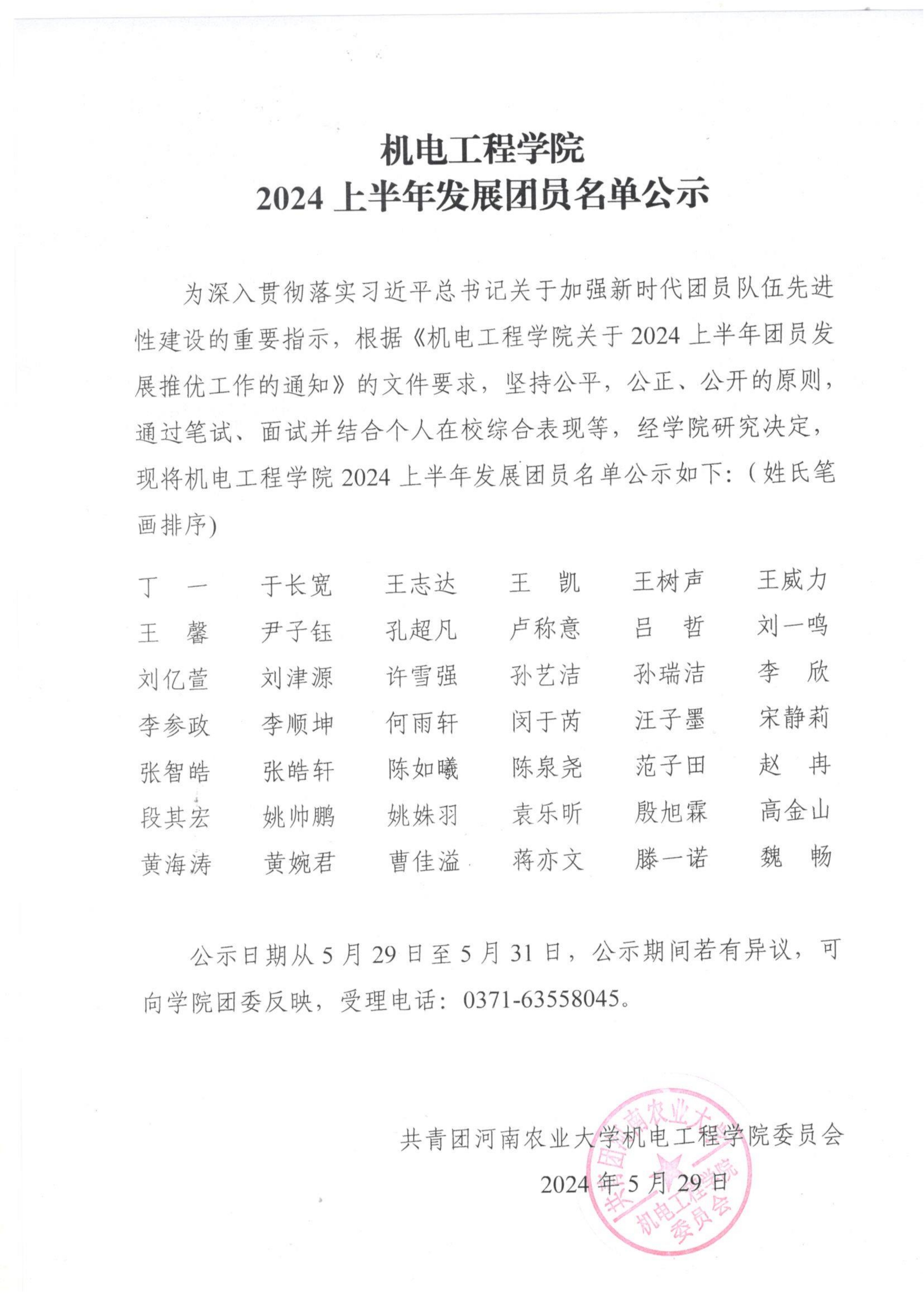 为深入贯彻落实习近平总书记关于加强新时代团员队伍先进性建设的重要指示,根据《91社区 关于2024上半年团员发展推优工作的通知》的文件要求,坚持公平、公正、公开的原则, 通过笔试、面试并结合个人在校综合表现等,经学院研究决定,现将91社区 2024上半年发展团员名单公示如下:(姓氏笔画排序)