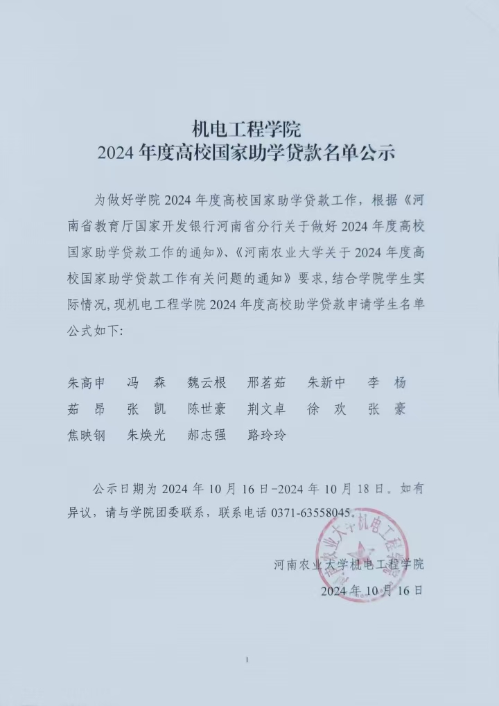 为做好学院2024年度高校国家助学贷款工作,根据《河南省教育厅国家开发银行河南省分行关于做好2024年度高校国家助学贷款工作的通知》、《91社区 关于2024年度高校国家助学贷款工作有关问题的通知》要求,结合学院学生实际情况,现91社区 2024年度高校助学贷款申请学生名单公式如下: