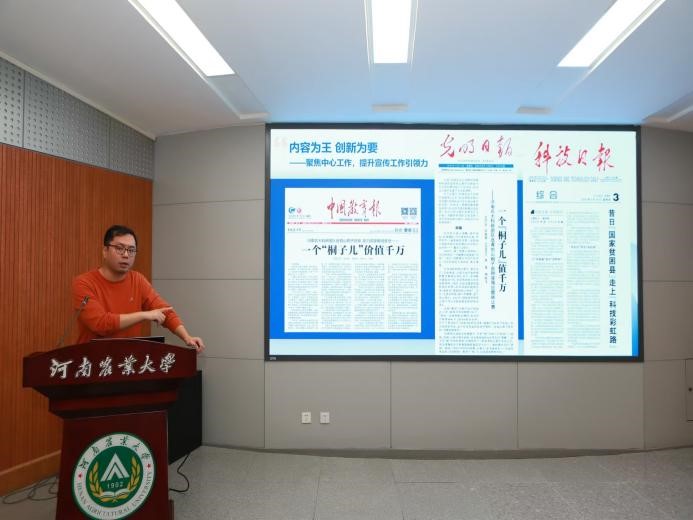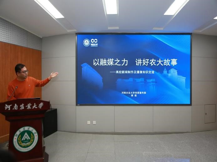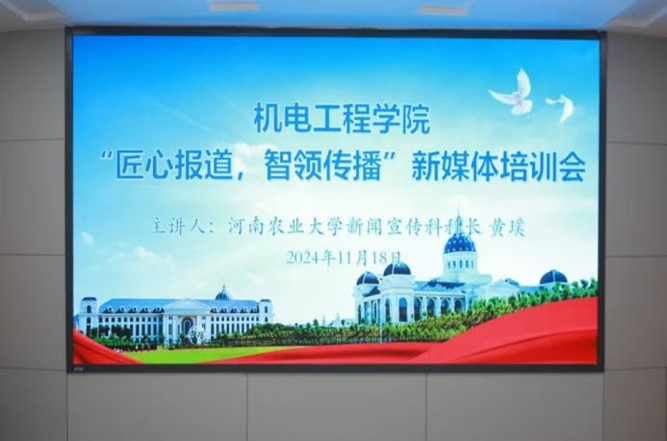 培训会上,黄璞以《以融媒为力--讲好农大故事》为题,结合自身在校工作的经历与现场同学分享了三点感悟:其一严谨采写,筑牢新闻基石,深入剖析新闻采访流程与写作要点,强调新闻特性;其二精通摄像,定格精彩时刻,介绍相机内存卡、镜头知识,讲解拍摄操作过渡、曝光三要素等要点,强调新闻摄影特性;其三创新理念,激发媒体活力,以“助农天团”为例阐述发挥农大优势与聚焦农业服务工作的宣传策略,举牌女孩视频案例彰显新媒体力量。最后,他激励同学们勇于创作,为学院宣传注入动力,助力学院在新媒体领域破浪前行。