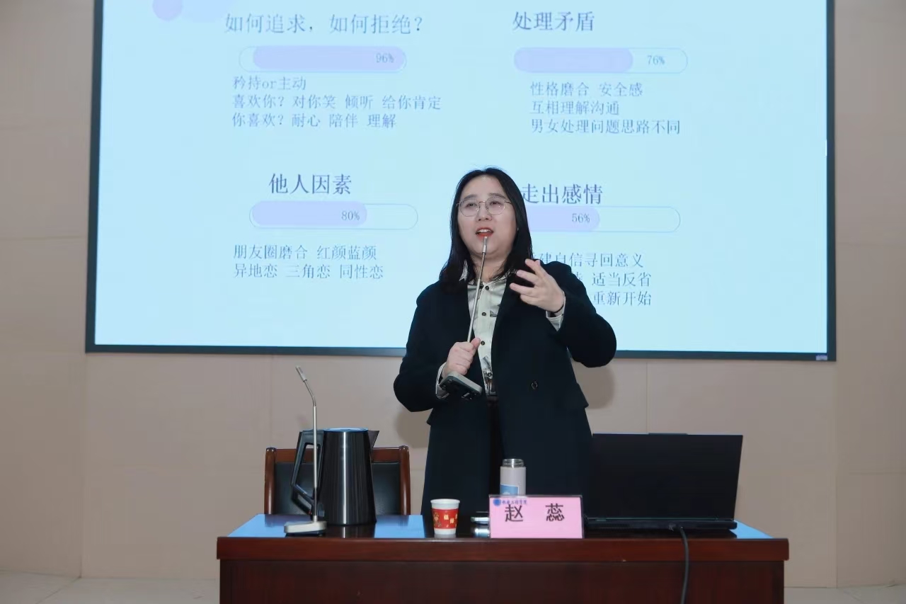 赵蕊以日常生活中的常见案例为切入点,引导同学们正确认识自我、悦纳自我,鼓励同学们通过恰当的自我展示增强自信心。在人际交往方面,赵蕊结合同学交往和恋爱观等话题,强调尊重与理解是建立良好关系的基础,并分享实用的沟通技巧,帮助同学们掌握正确的相处之道。活动中,赵蕊凭借丰富的经验和幽默的语言风格,赢得了同学们的阵阵掌声,现场氛围轻松活跃。
