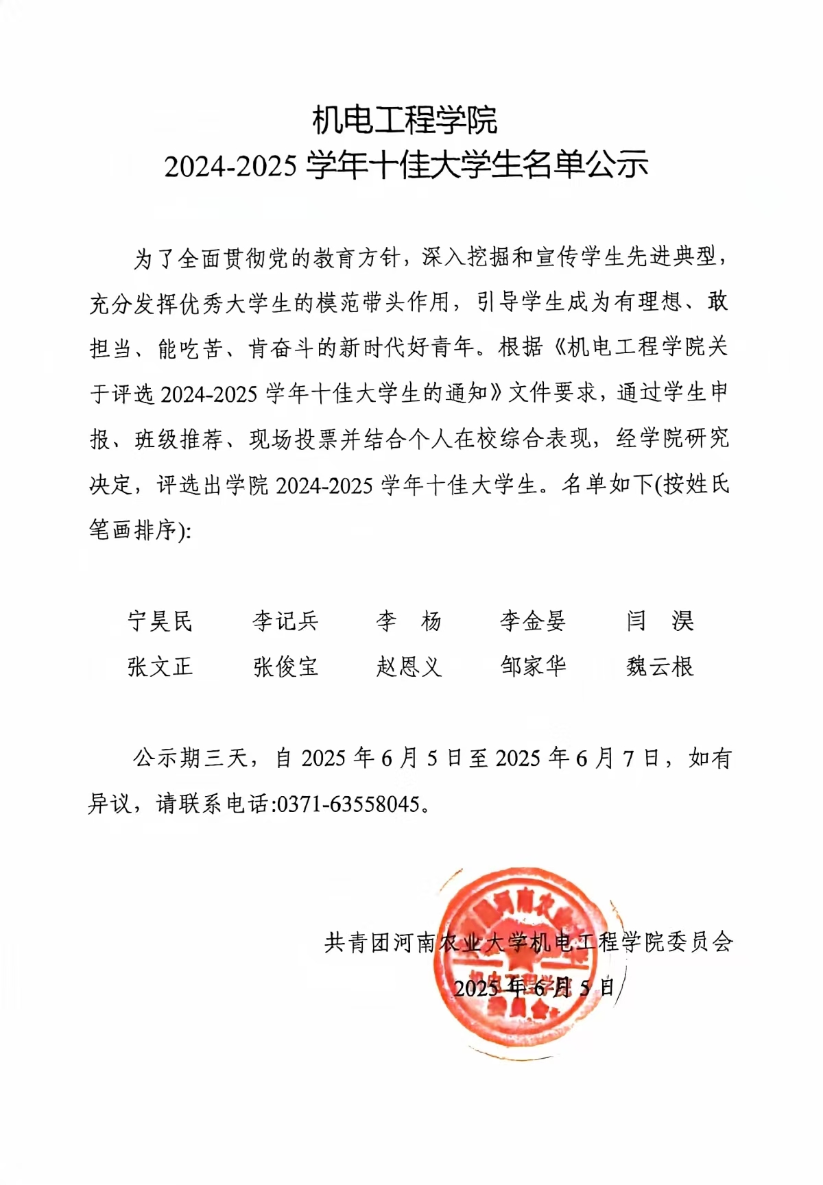 为了全面贯彻党的教育方针,深入挖掘和宣传学生先进典型, 充分发挥优秀大学生的模范带头作用,引导学生成为有理想、敢担当、能吃苦、肯奋斗的新时代好青年。根据《91社区 关于评选2024-2025学年十佳大学生的通知》文件要求,通过学生申报、班级推荐、现场投票并结合个人在校综合表现,经学院研究决定,评选出学院2024-2025学年十佳大学生。名单如下(按姓氏笔画排序):