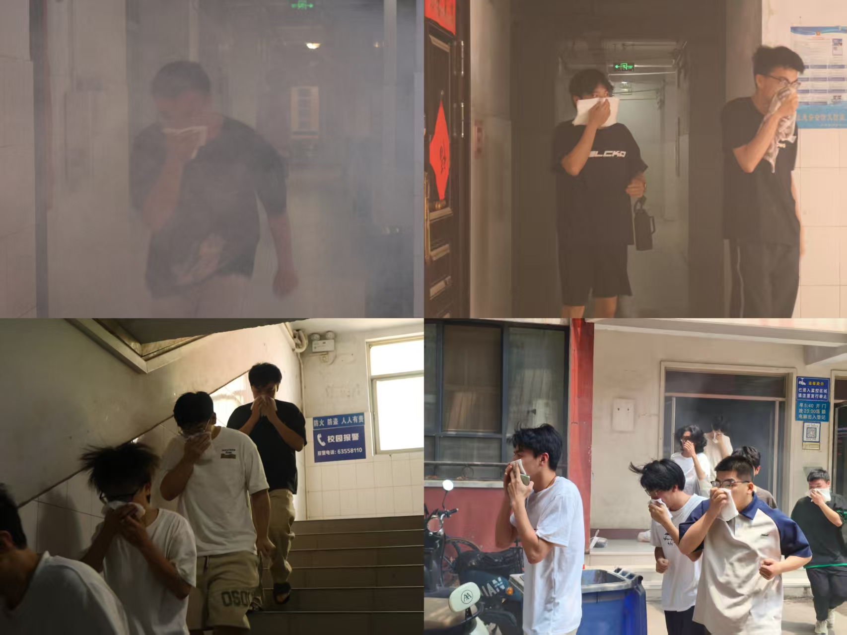演练伊始,尖锐的警报声在校园骤然响起,桃李园三号楼、八号楼内瞬间“浓烟”弥漫。同学们反应迅速,依照日常所学的消防逃生知识,立刻弯腰、用衣物捂住口鼻,沿着预先规划的安全通道,有序且快速地撤离至指定集合点。整个疏散过程紧张有序,充分展现出同学们良好的应急反应素养。