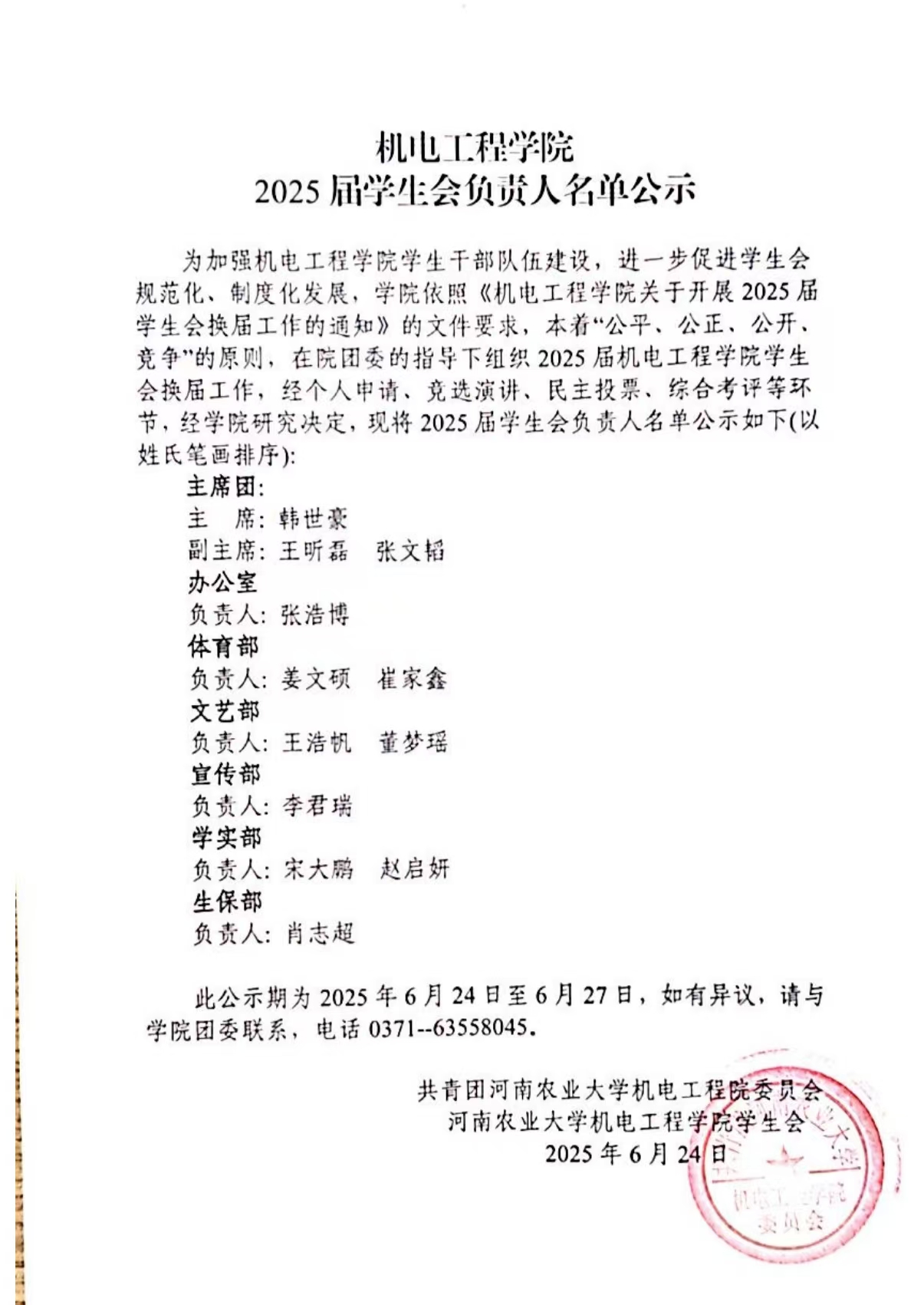 为加强91社区 学生干部队伍建设,进一步促进学生会规范化、制度化发展,学院依照《91社区 关于开展2025届学生会换届工作的通知》的文件要求,本着“公平、公正、公开、竞争”的原则,在院团委的指导下组织2025届91社区 学生会换届工作,经个人申请、竞选演讲、民主投票、综合考评等环节,经学院研究决定,现将2025届学生会负责人名单公示如下(以姓氏笔画排序):