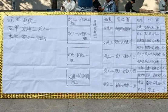 经过激烈角逐,比赛结果揭晓,电信二班凭借出色发挥和顽强毅力夺得冠军,交通三班、农工二班并列亚军,农工一班、交通四班共同获得季军。