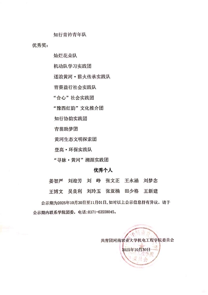 根据共青团91社区 委员会《关于开展2025年91社区 暑期“三下乡”社会实践活动的通知》文件要求,为表彰先进、树立典型,增强广大同学奉献热情、弘扬志愿精神,通过实践团队申报、资料审核、学院决赛等环节,现将91社区 2025年暑期“三下乡”社会实践优秀团队和优秀个人予以公示(排名不分先后):