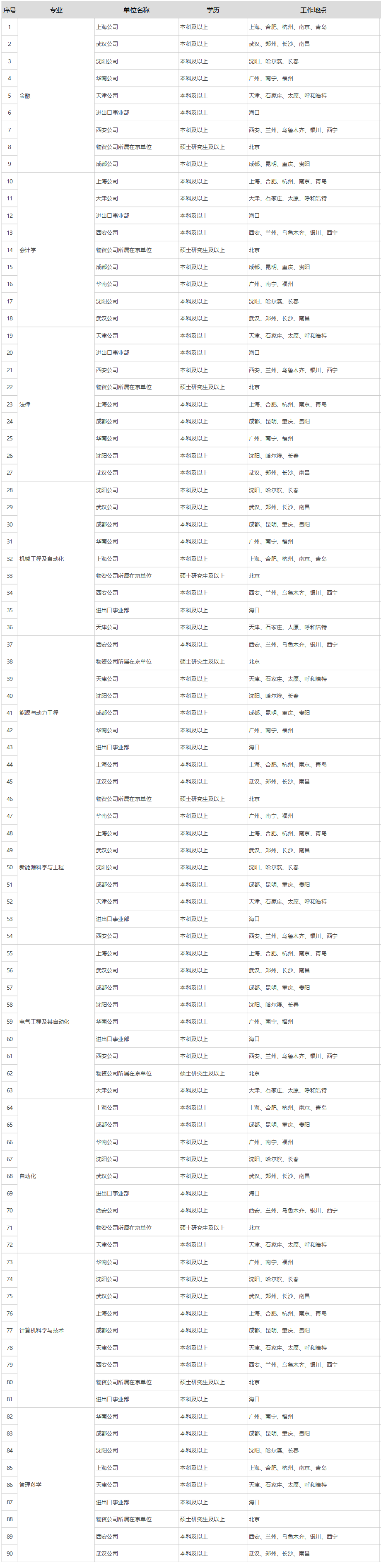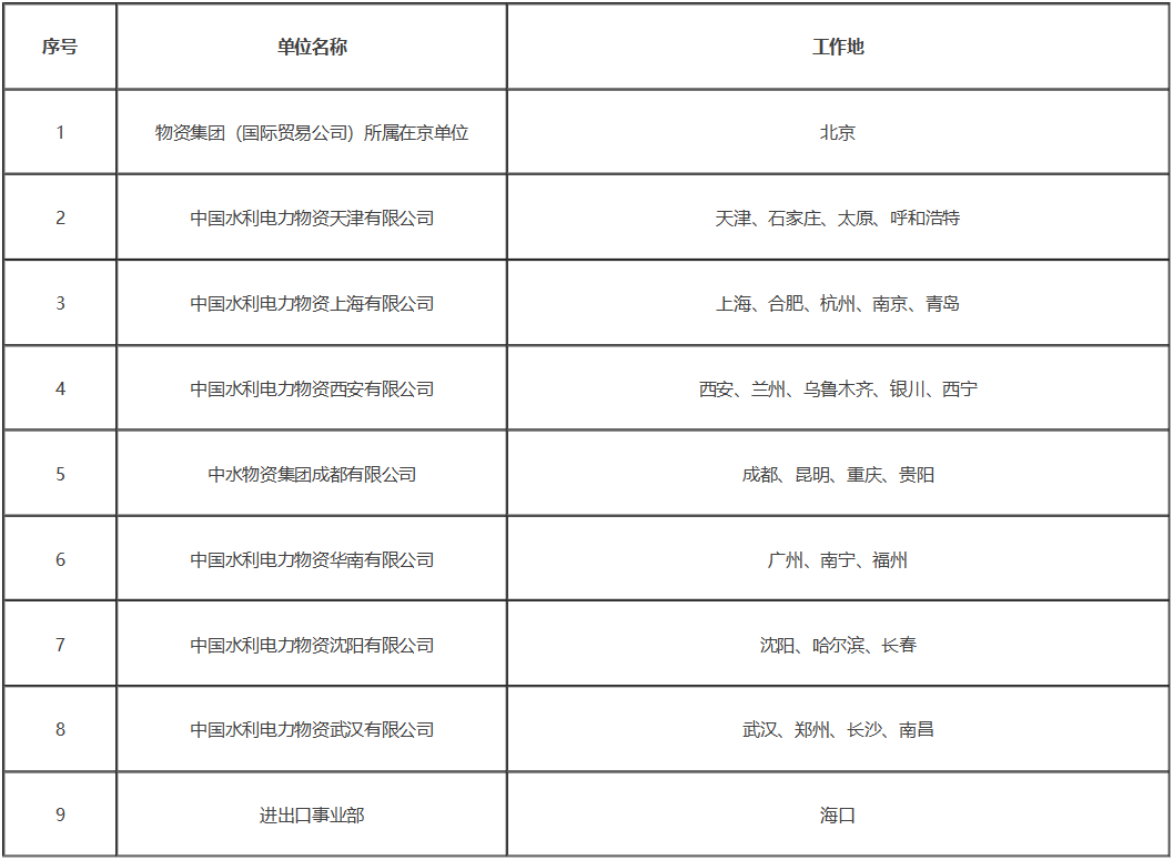 本次招聘单位分布在全国多个省份(见下表),其中物资集团(国际贸易公司)所属在京单位有:供应链服务中心(采购研究中心)、财务共享服务中心、招投标事业部(北京国电工程招标有限公司)、重工事业部、配送事业部、仓储事业部、北京中唐电工程咨询有限公司、大唐电商技术有限公司、中国水利电力物资北京有限公司、北京大唐兴源物业管理有限公司。